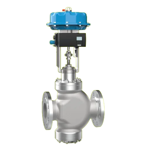 DUALVENT is a double-seated valve that is used for more severe applications. The double-seated trim regulates the medium at two throttle points. The two control plug diameters are matched to each other in such a way that the medium has an opening influence on one control plug and a closing influence on the other control plug, and the actuating forces thus are minimized. Thanks to the variety in the choice of materials, the connection to the piping system or the versatile trims, the control valve can be precisely aligned to your process and the dirty medium. This also applies to the shaping of the control plugs. The option of a multi-stage, double-seated trim also avoids cavitation that could lead to shock waves and erosion damage to the valve body and internal parts. You are on the safe side with the DUALVENT control valve, even with tough applications. Of course, our complete actuator and controller program is available for the actuating of the double-seated valves.